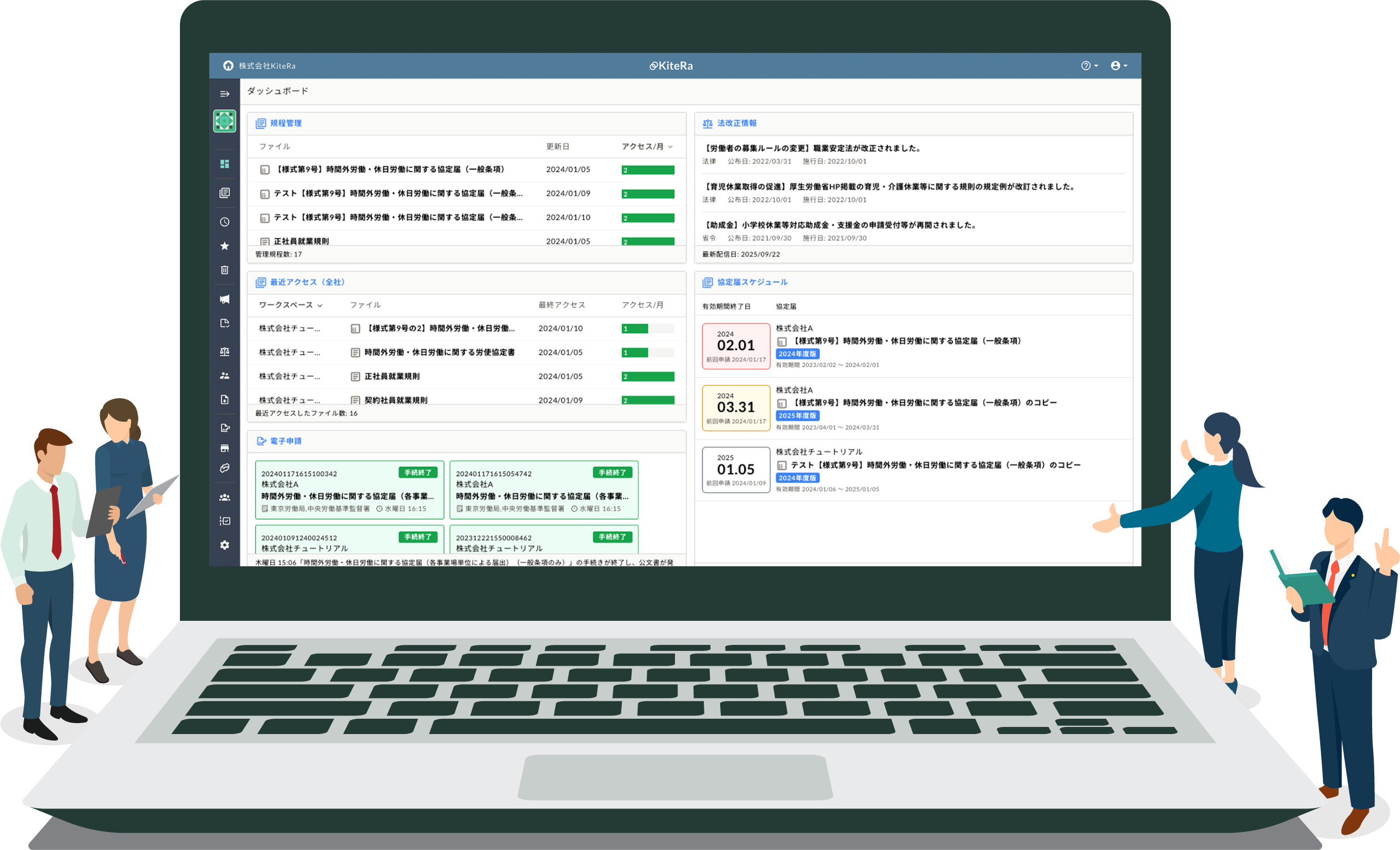 KiteRa Bizは社内規程や労使協定書の編集・管理のDX化を通じて、コーポレートガバナンスや内部統制の実行性を高め、積極的な企業経営の後押しとなる基盤作りと本質的な企業価値の向上をサポートします。